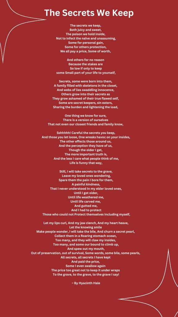 Hi everyone, welcome to Hyacinth Hale Poetry! I am a poet who focuses on freeform and narrative poetry. I encourage you to read my poetry aloud to your friends, your family, your lovers, and even yourself. Poetry is meant to be experienced through sight, sound, emotion, through yours and the author’s imagination. Please, browse through my collections of poetry at the top of the page, and scroll down the home page for feature poems. Feel free to discuss the poetry in the comment section. Thank you for coming on my journey and experiencing my poetry with me. Don’t forget to subscribe to the newsletter for the latest posts, poems and content below!